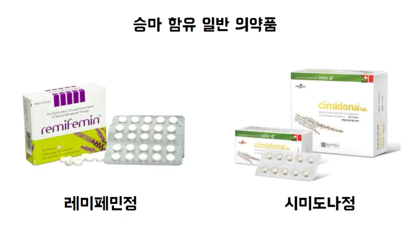 이 승마의 호르몬 조절 기능을 활용하여 만든 일반의약품 제품은 레미페민정과 시미도나정이 있으며 각각 독일산(레미페민), 스위스산(시미도나) 승마 원료를 표준화하여 사용한 제품입니다.