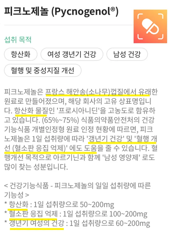 파이토케미컬은 식물에서 유래한 항산화 물질입니다. 갱년기 및 항산화가 주 목적이라면 소나무 껍질 추출물(피크노제놀) 을 선호해요.