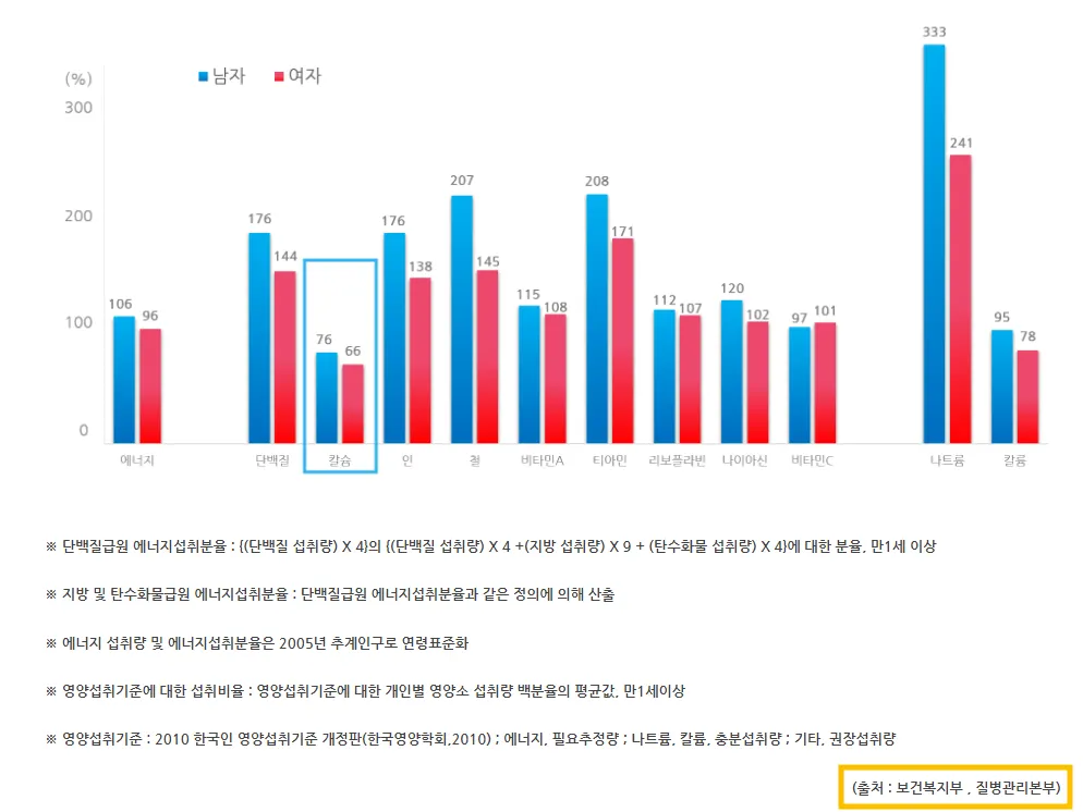 칼슘은 연령에 관계 없이 보건복지부에서 정한 일일 섭취량 기준치에 비해 부족한 성분이니, 칼슘이 풍부한 식품 (멸치, 우유, 아몬드, 브로콜리 등) 을 섭취하세요. 만약 식품으로 충분한 칼슘을 섭취하기 어렵다면, 영양제로 섭취하셔도 좋아요.