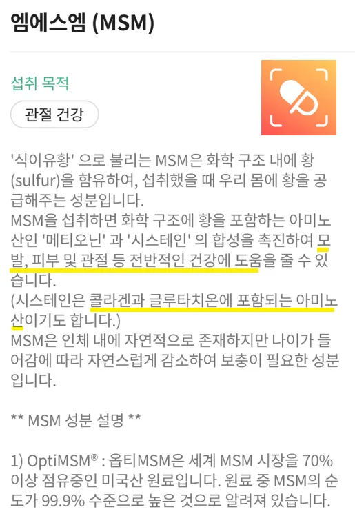 MSM은 관절 건강을 위해서도 섭취 가능하지만 모발 건강에도 도움을 줄 수 있으며, 콜라겐은 피부와 모발 건강. 비타민 C는 항산화 및 콜라겐 합성을 촉진하는 작용이 있어요.
